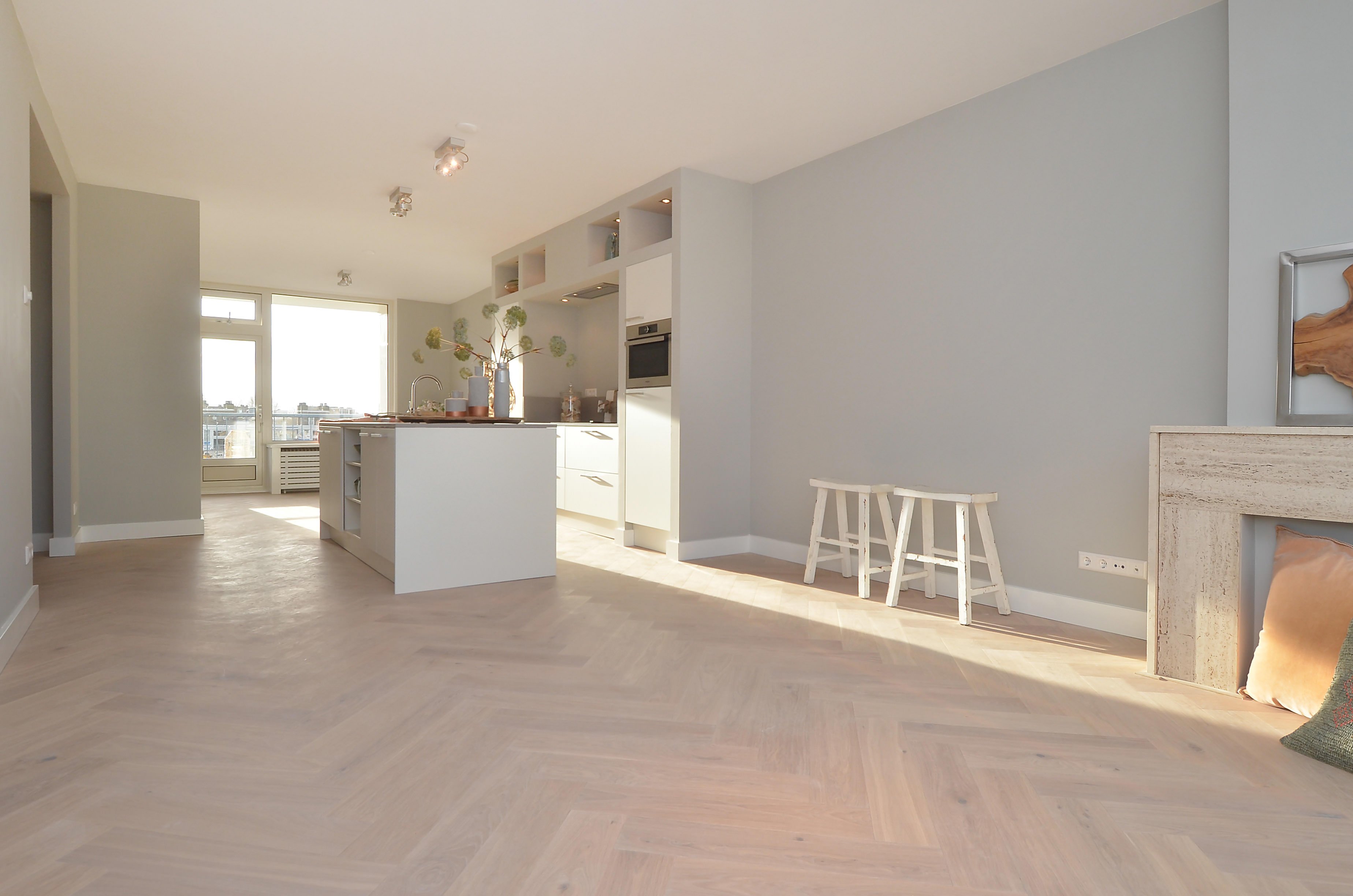 Entree, ruime hal met visgraat parket doorgelegd in het hele appartement, meterkast, vaste kast met opstelplaats wasmachine en droger en vaste kast met opstelplaats elektrische boiler.