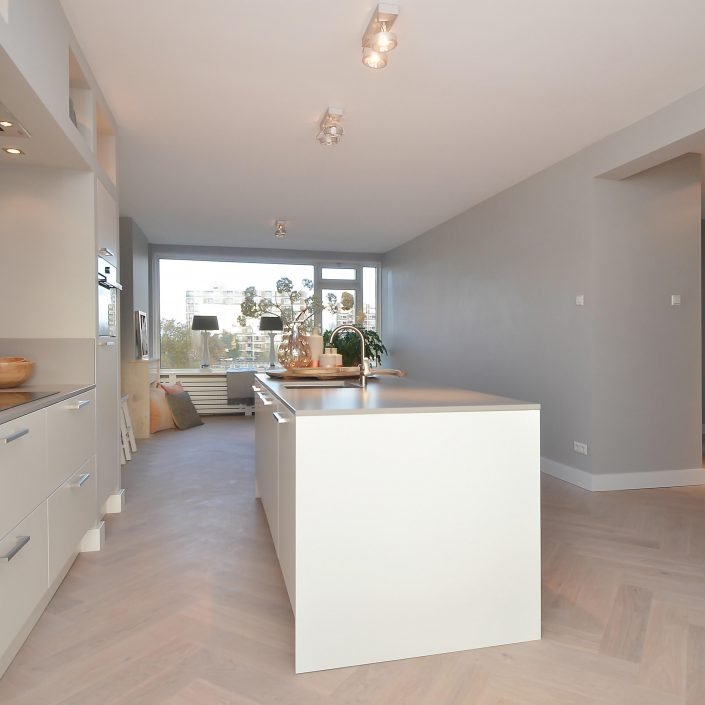 Toegang naar royale woon-/ eetkamer ca. 11.50 x 4.00 deels 3.18 met schouw en fraaie woonkeuken met veel kastruimte en voorzien van diverse inbouwapparatuur, zoals inductiekookplaat, inbouwafzuigkap, vaatwasser, koel/vriescombinatie en combi-magnetron.